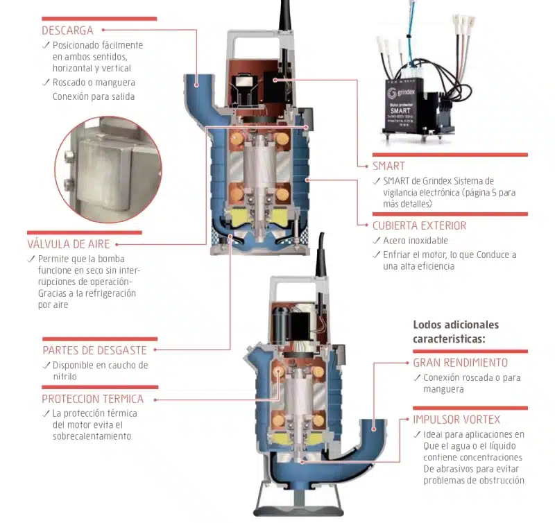 Además, cuenta con protección térmica del motor, impulsor Vortex para evitar problemas de obstrucción, refrigeración por aire y sistema de vigilancia electrónica SMART.